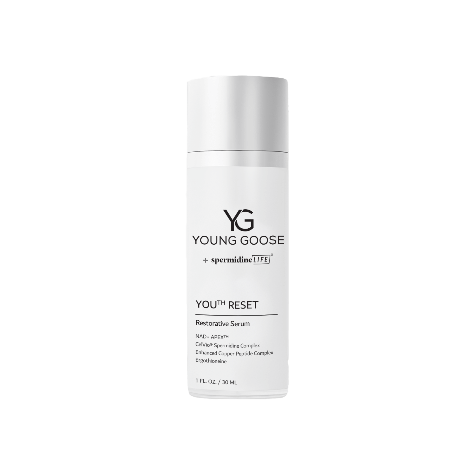 Skin-longevity serum with NAD+ precursors, spermidine, copper peptides, and antioxidants to support a visibly younger-looking complexion.